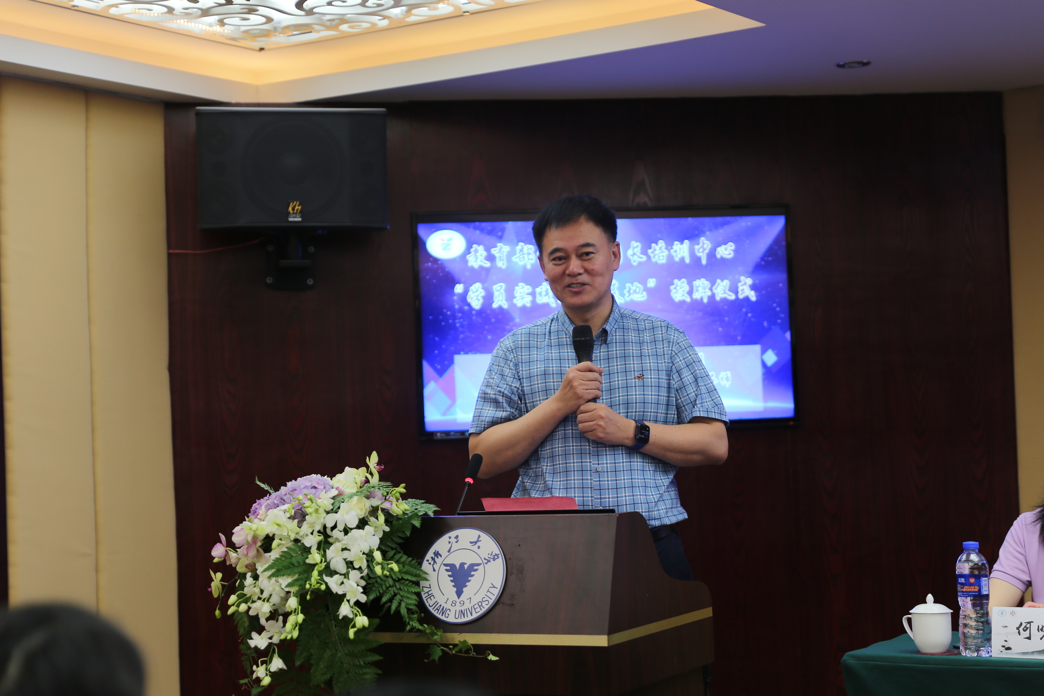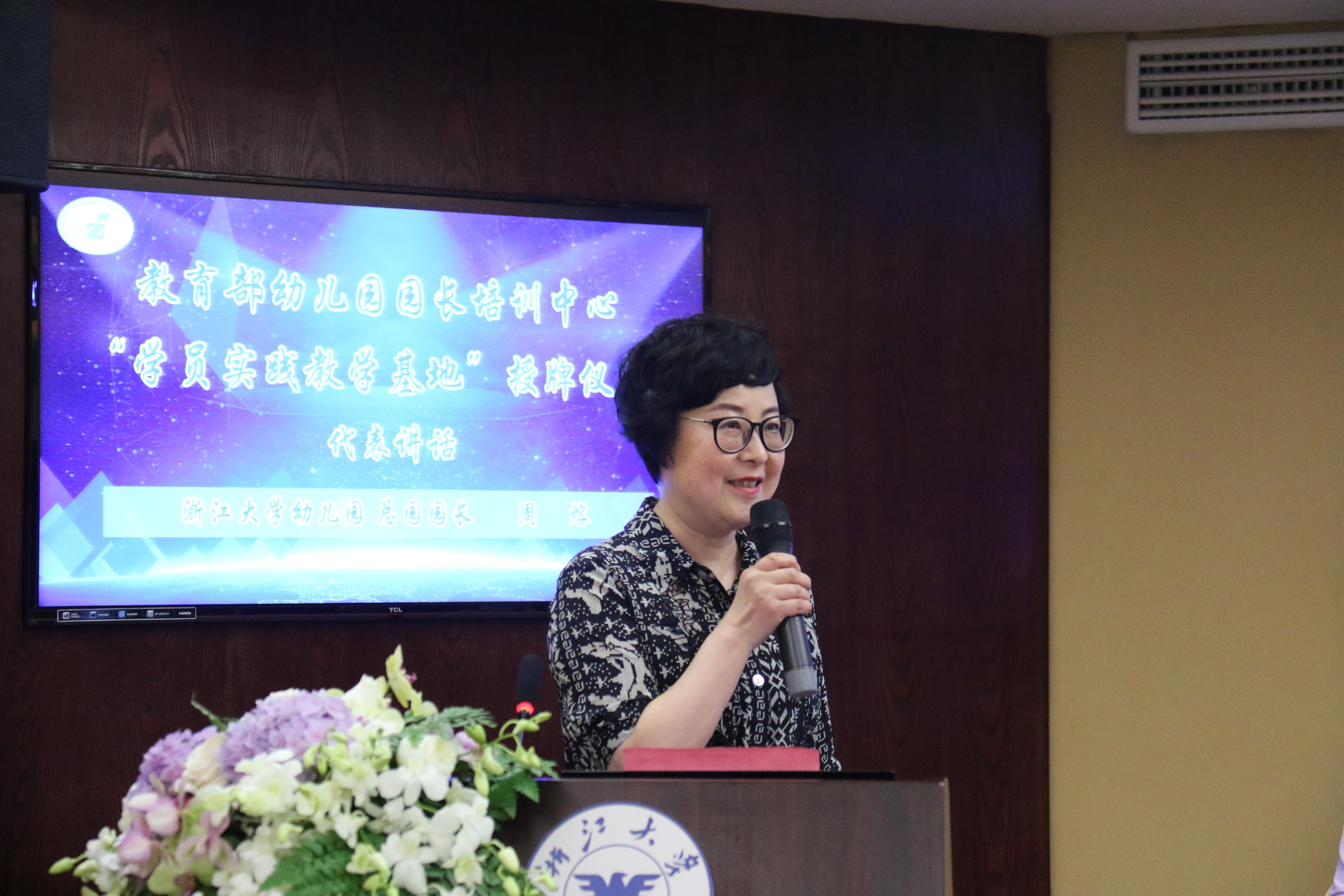 5月13日上午,教育部幼儿园园长培训中心“学员实践教学基地”授牌仪式在浙江圆正·灵峰山庄报告厅隆重举行。教育部园长培训中心第六期、第七期全国幼儿园优秀园长高级研究班共67名园长以及浙江大学幼儿园领导班子、各部门负责人、教师代表、媒体记者等80余人参加了活动,活动由第七期全国幼儿园优秀园长高级研究班班主任温佳玉主持。