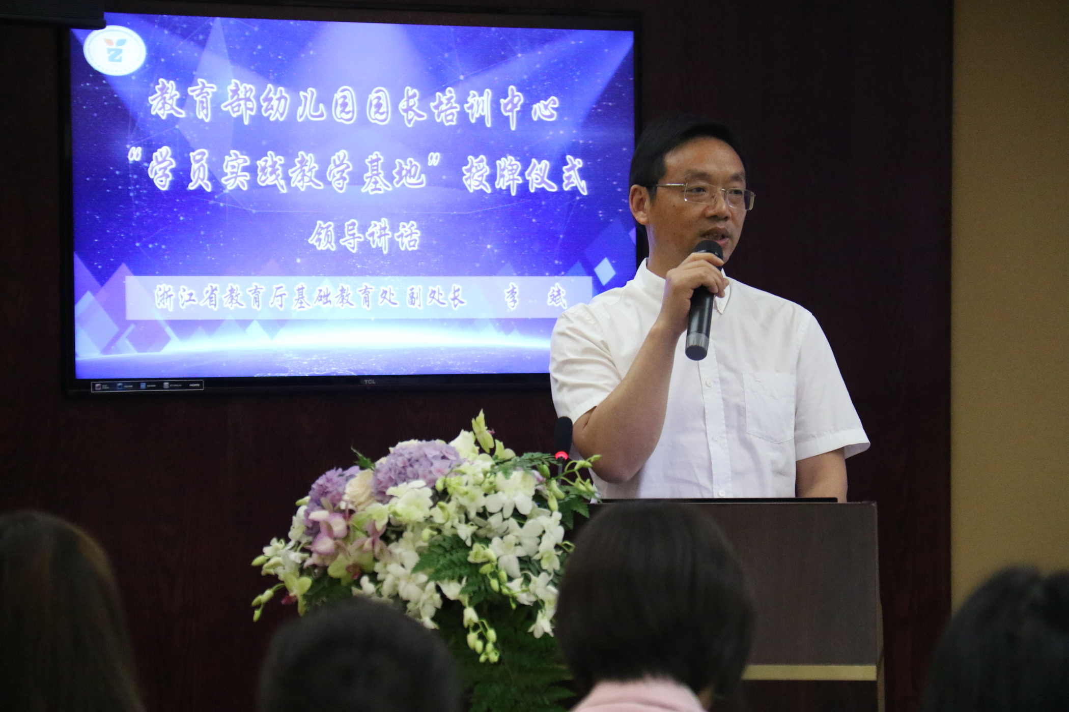 授牌仪式上,浙江省教育厅基教处副处长李斌代表浙江省教育厅致欢迎辞,对浙大幼儿园表示祝贺,对教育部园长培训中心的领导专家表示感谢,对全国幼教同仁表示热烈欢迎,并向与会人员介绍了浙江省推动学前教育发展的各方面努力与现有成效。如,开启多轮专项三年行动计划、审议通过《浙江省学前教育条例》、印发《浙江省关于学前教育深化改革规范发展的实施意见》、硬件基础建设与保育教育质量“两手抓”、突出师资队伍建设等。在浙江省学前教育不断发展的当下,李斌处长鼓励浙江大学幼儿园进一步发挥全省龙头示范引领作用,以“学员实践教学基地”为契机为浙江省学前教育进一步提升做出新的贡献。