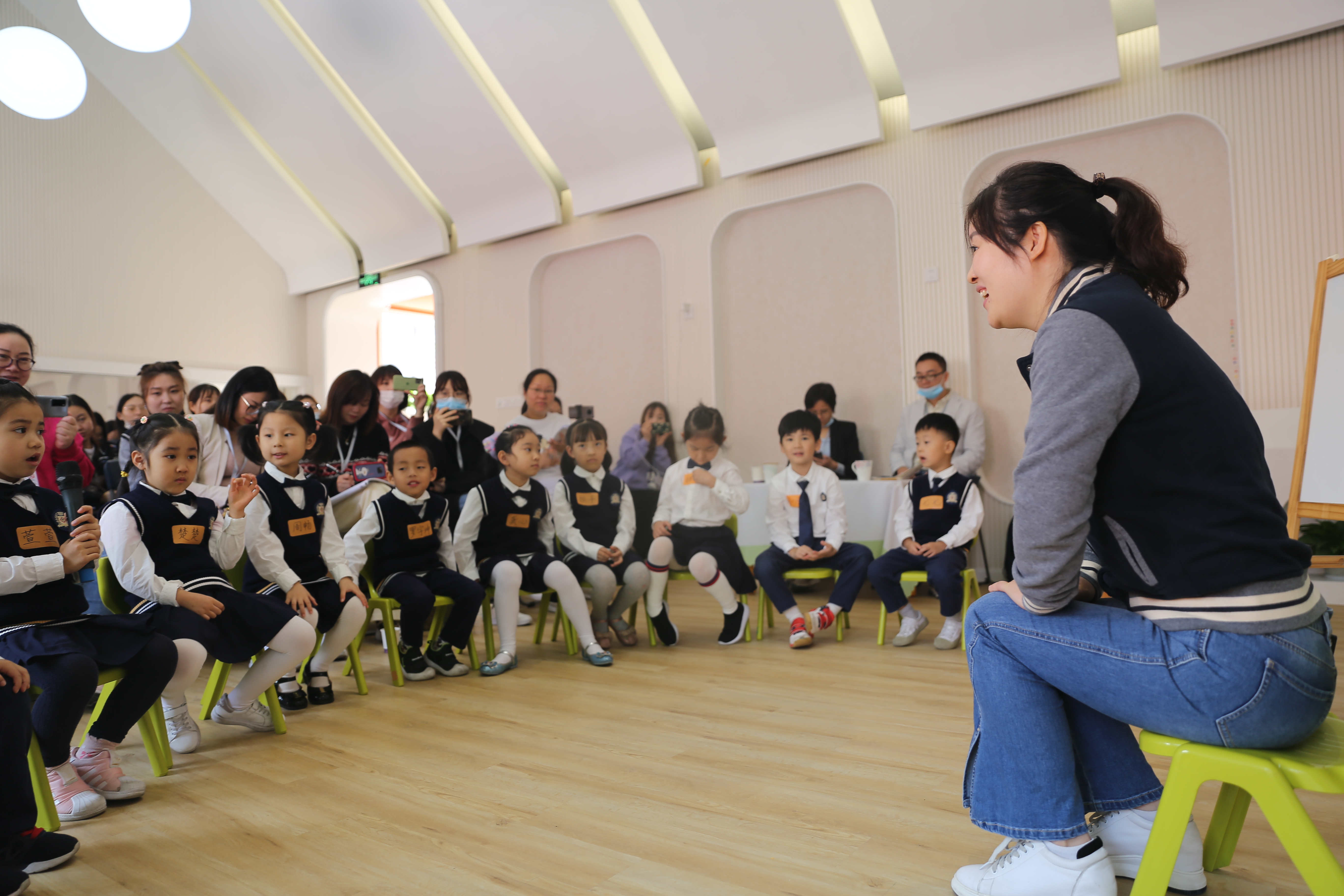 入园前,全体参观人员严格按照疫情防控要求进行体温监测、登记和消毒,随后参观了园所及班级环境,感受园内儿童哲学环境的氛围。之后老师们来到三楼音乐厅,副园长鲍玲玲作了以《走进孩子的心灵—实验小哲学家园本课程的实践》为题的汇报,介绍了我园在开展儿童哲学启蒙教育一年时间内的思考与收获。楼梦娜老师和何平老师分别展示了《游戏的那些事儿》《我的邻居是坏蛋》大班哲学活动,并进行说课。幼儿在体验、交流、辨析的过程中梳理关于游戏的经验建构,大胆表达对“坏蛋”的理解,同伴间不断进行思想的碰撞,在场的老师们被儿童哲学的魅力深深感染着。