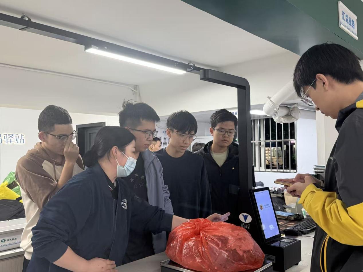 第三周活动以“寄件岗位实践”为核心,并与第二周的绿色回收成果衔接,构建起从“收集—处理—再利用”的完整环保实践闭环。同学们分批进入白沙邮递服务站寄件区,开展每次一小时的岗位体验。在带教老师的耐心指导下,大家首先系统学习寄件流程:核对寄件人信息、检查包裹内物品、规范粘贴面单等。带教老师重点讲解了禁限寄物品中易燃易爆品、管制刀具等常见禁寄物品明细,帮助学生树立寄件安全意识。随后,同学们将第二周回收整理出的可二次利用纸箱重新用于现场包裹封装,免费提供给有寄件需求的同学。这一举措真正实现了“纸箱回收—分类处理—二次使用”的资源闭环流转。从学习寄件规范到参与环保封装,同学们在岗位实操中不仅掌握了基础服务技能,更切身感受到绿色理念融入日常工作的实际价值。此次活动进一步推动了劳动教育与环保教育的有机融合,也为三周系列实践画上了富有意义的句号。